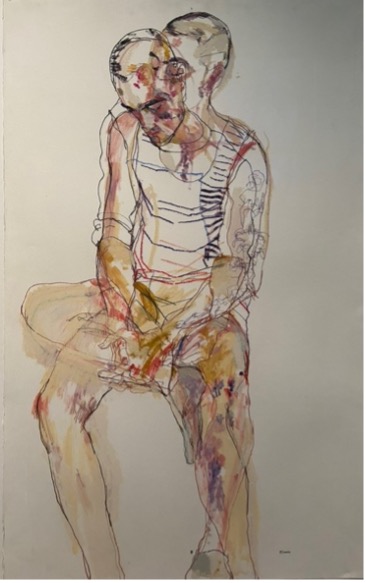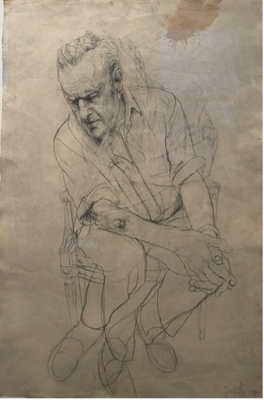 Saville, whose artistic practice has been described as “reinventing figure painting for contemporary art”, invokes her deep fascination for the extremities of anatomy, focusing with greater detail on the features of the face and the hands of the subject. Her study, painted with black charcoal over a stained-aged piece of parchment, shows an anatomically more detailed image of a man sitting on an armed chair, surrounded by additional lines that represent the remnants of what was his previous pose. A peaceful, yet dynamic expression of his movements during the sitting. Unlike Saville’s, the drawing of the figurative abstract artist Howard Tangye includes some layers of colour, while also exploring the essence of the subject through his movement – perhaps even his feelings – during the sitting. The portrait of the late Richard Nicoll presents him in two calm, meditative overlayered poses. With his eyes closed, his hands with fingers intertwined on his lap, one outline shows him with his legs separated and his head hanging down (as if asleep), while the other shows a more active posture, immersed in thought, with his right ankle over his left knee. The quiet yet colourful image – contrasting with Saville’s monochromatic work – almost seems to reflect with this movement of the lines the taciturn mood of the subject.